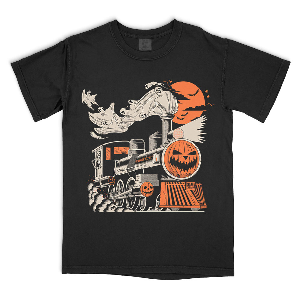 All aboard the October Express. This Terror Threads original takes you on a spooky ride through Halloween night with a ghost-fueled steam engine charging ahead. Featuring jack-o’-lantern headlights, swirling specters, and a moonlit sky crawling with bats, this design captures the magic of fall in full motion. For those who know Halloween isn’t just a season—it’s a destination.