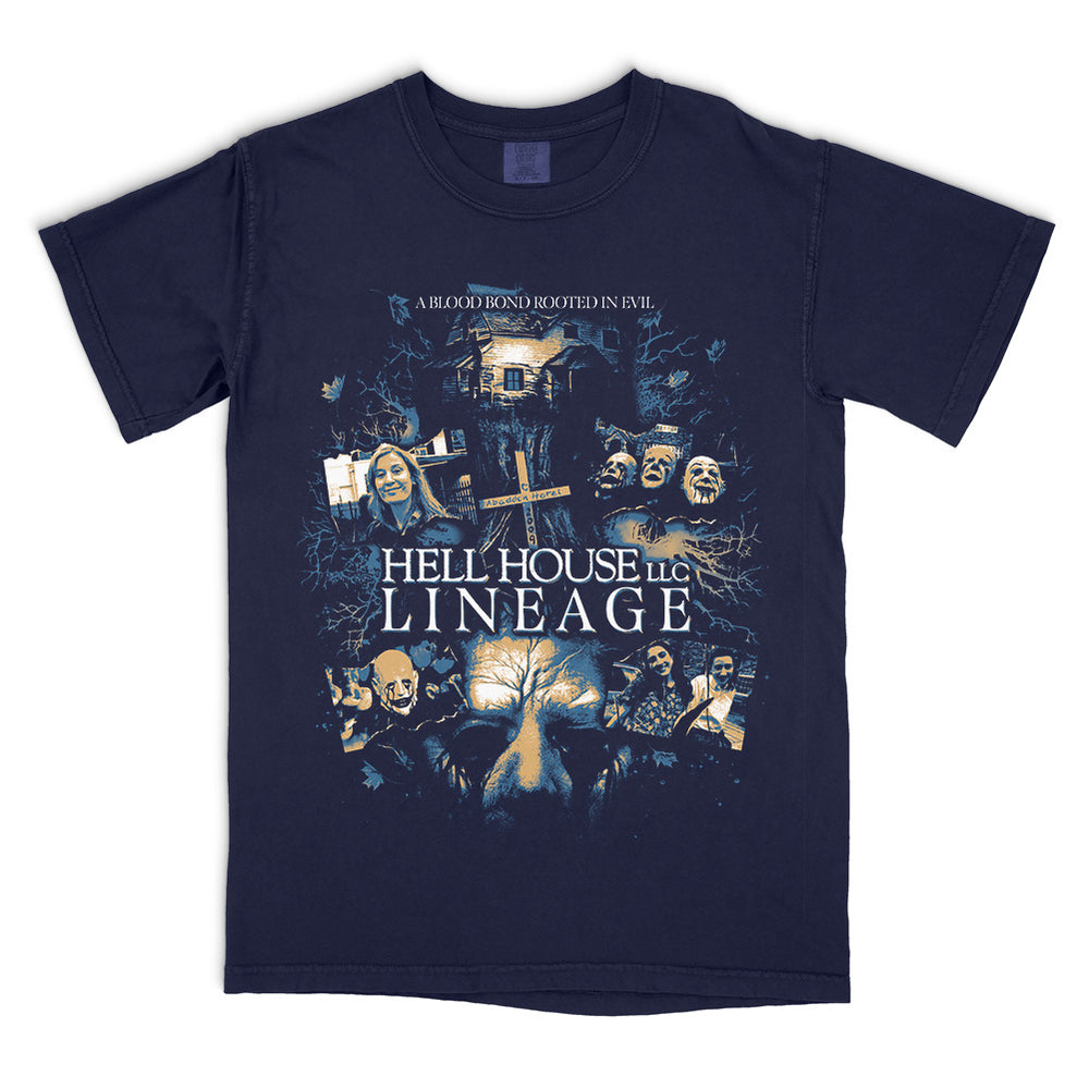 The Abaddon Hotel has never let go of its secrets—and this shirt proves it. The officially licensed Hell House LLC: Lineage "Rooted In Evil" T-Shirt brings the nightmare to life with a collage of sinister imagery: haunted faces, cursed grounds, and the shadow of evil that spreads from the roots of the house itself. Printed in eerie blue and bone tones on a premium navy tee, this design is a must for fans who know the terror of Hell House runs deeper than the walls—it’s in the bloodline.