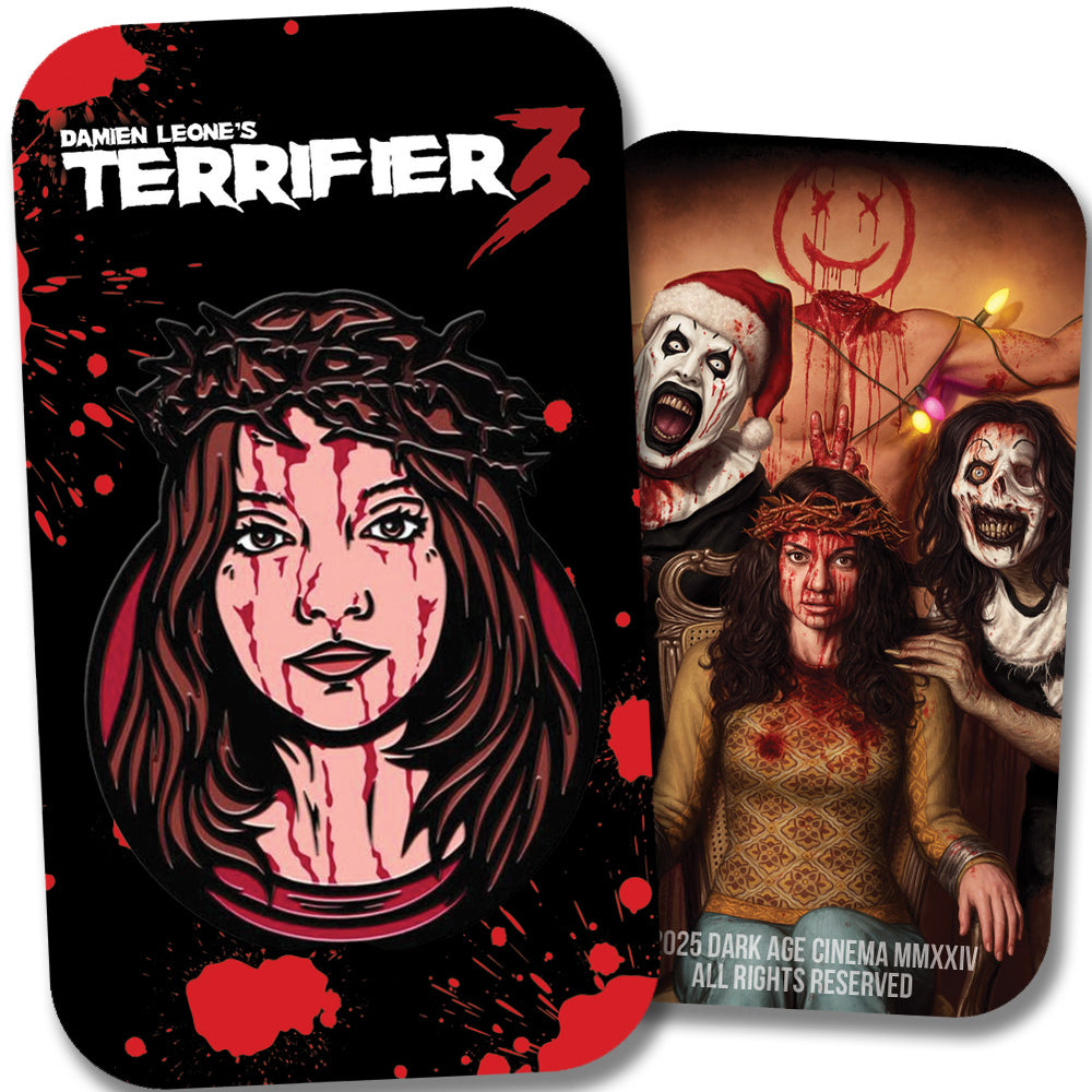 Striking, symbolic, and soaked in blood—our officially licensed “Crowned” pin captures Sienna from Terrifier 3 in one of her most unforgettable moments. With a crown of thorns, wide-eyed stare, and crimson-streaked face, this cloisonné enamel pin brings bold detail and high contrast to any collection. Finished with a black nickel base and secure rubber clutches, it’s a piece that’s as tough as it is terrifying.