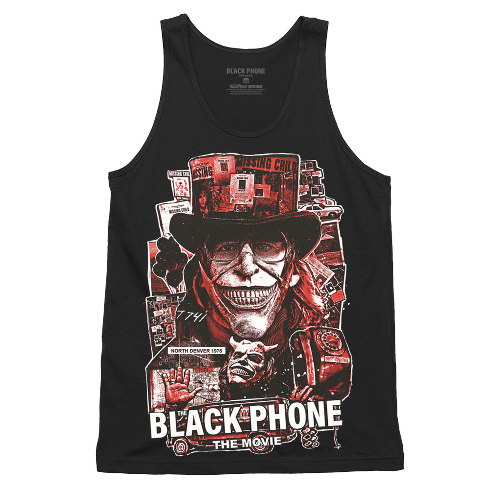 Step into the shadows of North Denver, 1978 with our officially licensed “Gone Missing” tank top from The Black Phone. This gritty design features The Grabber with his terrifying grin and top hat, surrounded by a chilling collage of missing child posters, newspaper clippings, and blood-streaked details. Every element drips with dread, capturing the fear that haunted the streets as kids vanished without a trace. This one hits hard—and it’s meant to.
